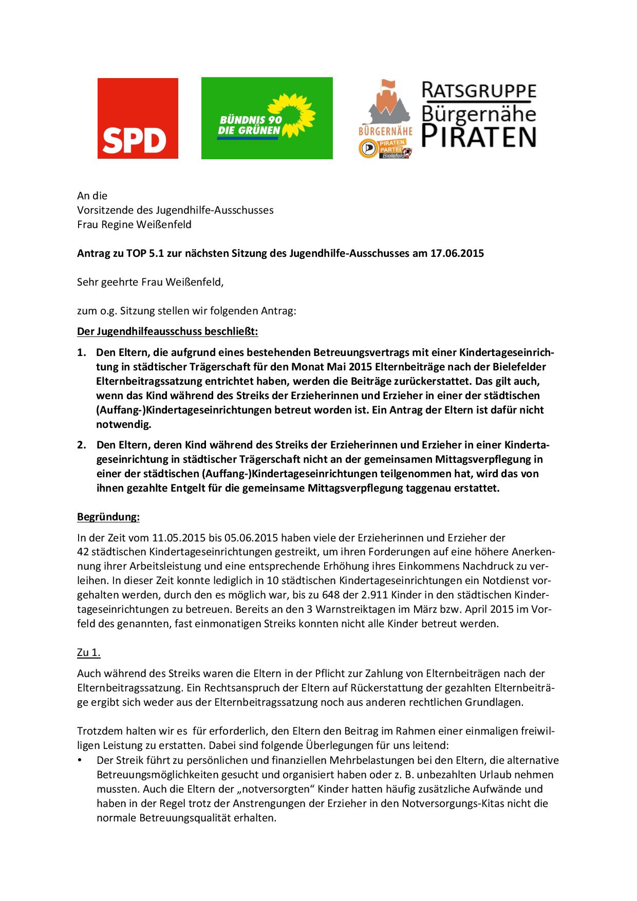 1. Den Eltern, die aufgrund eines bestehenden Betreuungsvertrags mit einer Kindertageseinrichtung in städtischer Trägerschaft für den Monat Mai 2015 Elternbeiträge nach der Bielefelder Elternbeitragssatzung entrichtet haben, werden die Beiträge zurückerstattet. Das gilt auch, wenn das Kind während des Streiks der Erzieherinnen und Erzieher in einer der städtischen (Auffang-)Kindertageseinrichtungen betreut worden ist. Ein Antrag der Eltern ist dafür nicht notwendig.