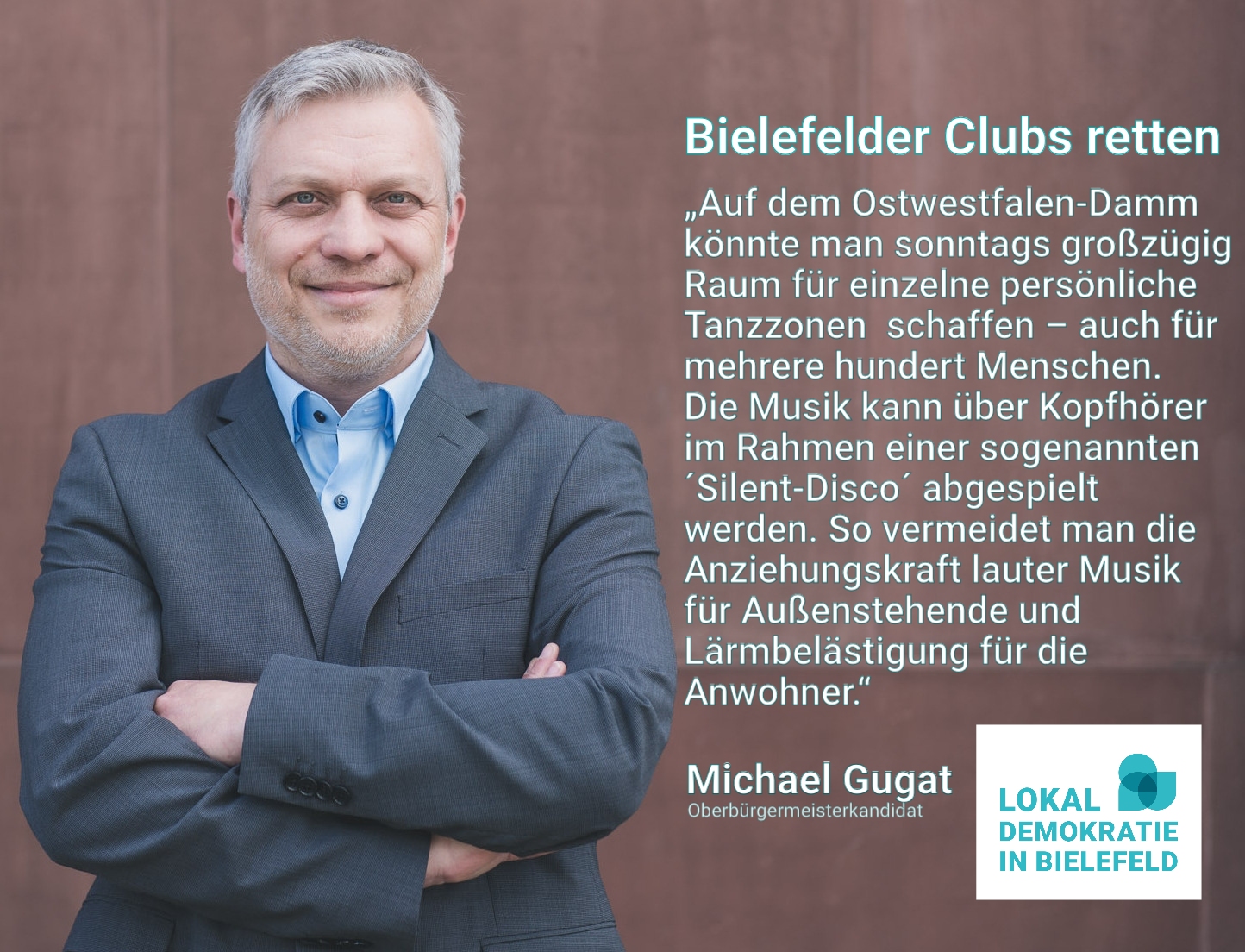 Um die Bielefelder Gastronomie- und Clubszene zu unterstützen, fordert der Oberbürgermeisterkandidat von Lokaldemokratie in Bielefeld, Michael Gugat, dass auch darüber nachgedacht wird, größere Straßen an einzelnen Tagen oder komplett zu sperren, um Raum für diese Unternehmen zu schaffen.