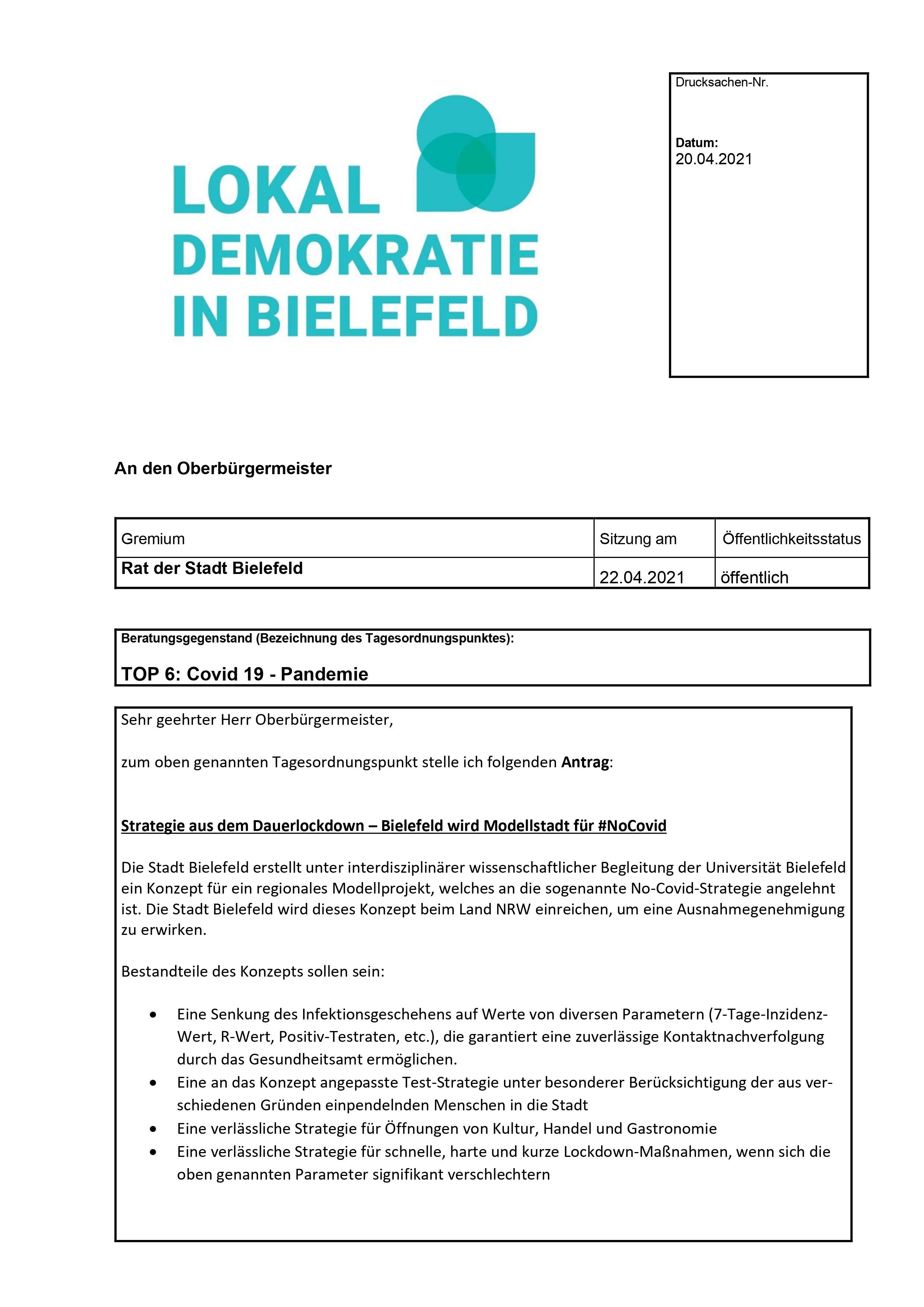 Der Kern des Antrages der Lokaldemokratie in Bielefeld ist die Forderung nach einer Strategie zur Eindämmung der Pandemie.