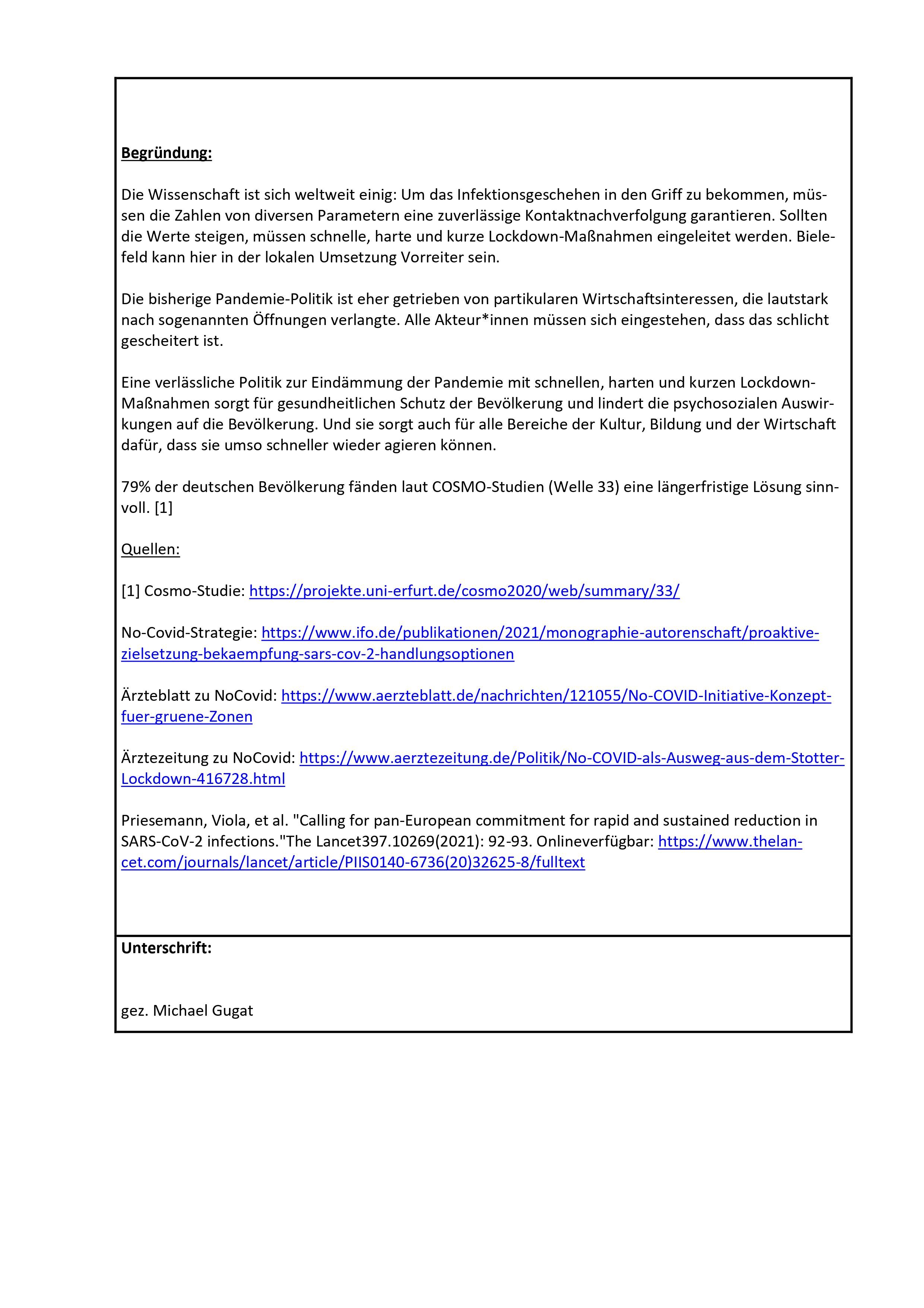 Bielefeld kann Vorreiter sein, wir können Modellstadt sein für eine nachhaltige, wissenschaftsbasierte Pandemiebekämpfung. Wir werden noch lange mit der Pandemie leben müssen, die Konzentration nur auf Impfungen wird nicht ausreichen. Das hat unter anderem das Beispiel Chile bewiesen, das eine der weltweit höchsten Impfquoten hat und das dennoch wieder in einen harten Lockdown gehen mußte, weil sie ohne Strategie zu schnell zu viel gelockert haben.