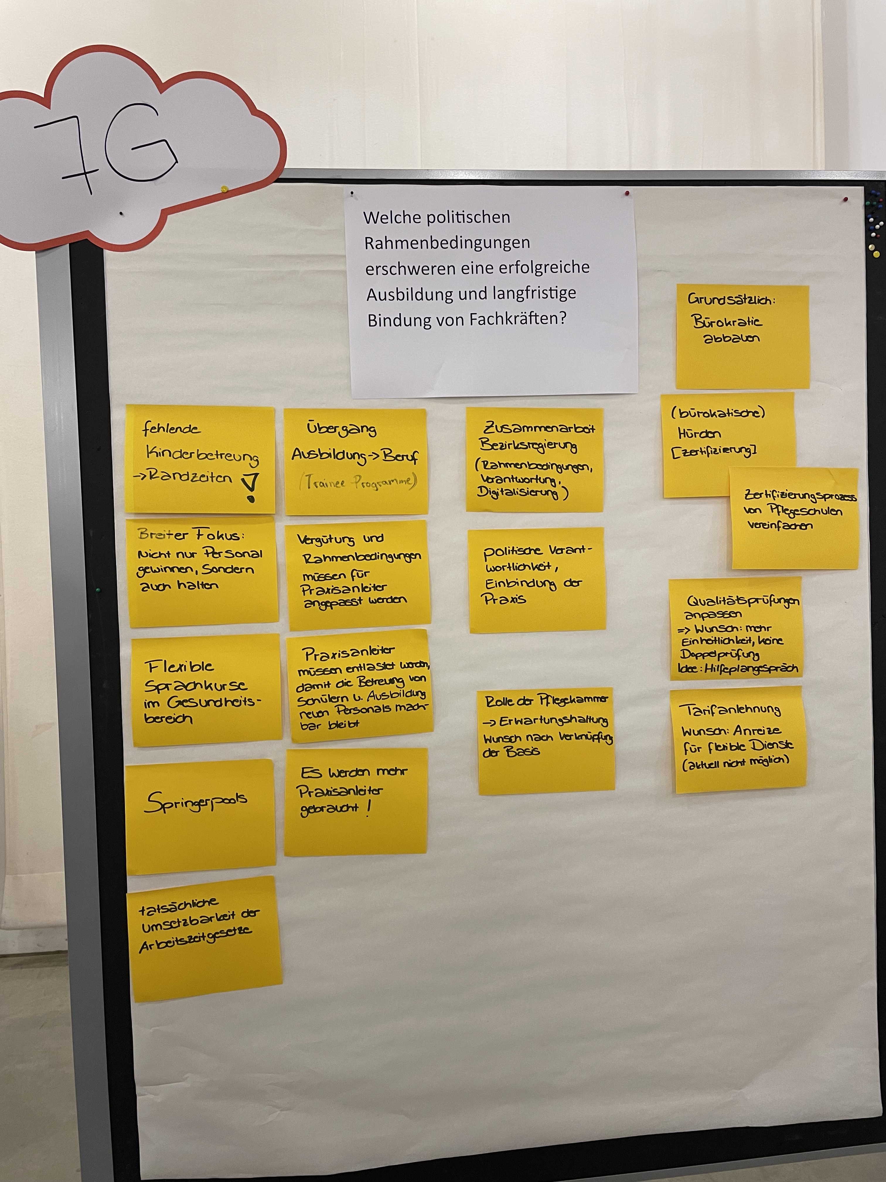 In dem von mir besuchten Workshop ging es um die Frage, welche politischen Rahmenbedingungen eine erfolgreiche Ausbildung und langfristige Bindung von Fachkräften erschweren. Auf der Pinnwand wurde schnell deutlich, dass viele strukturelle und organisatorische Hürden bestehen: fehlende Kinderbetreuung und unflexible Randzeiten, zu wenig Unterstützung beim Übergang von der Ausbildung in den Beruf, unzureichende Vergütung und mangelhafte Rahmenbedingungen für Praxisanleiter*innen. Auch Themen wie die fehlende Verzahnung von Theorie und Praxis, der hohe bürokratische Aufwand bei der Zertifizierung von Pflegeschulen oder der Wunsch nach flexibleren Arbeitszeitmodellen spielten eine große Rolle.