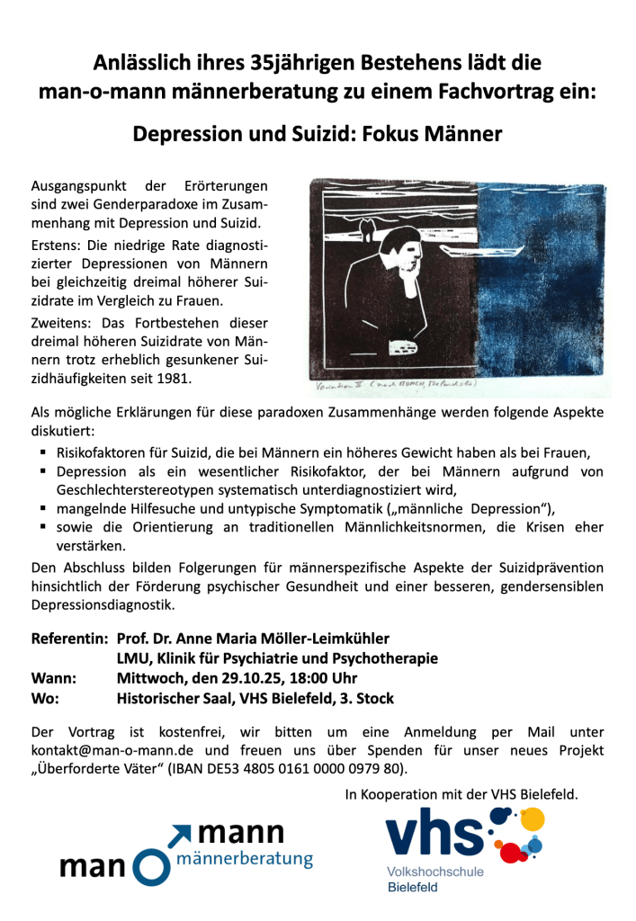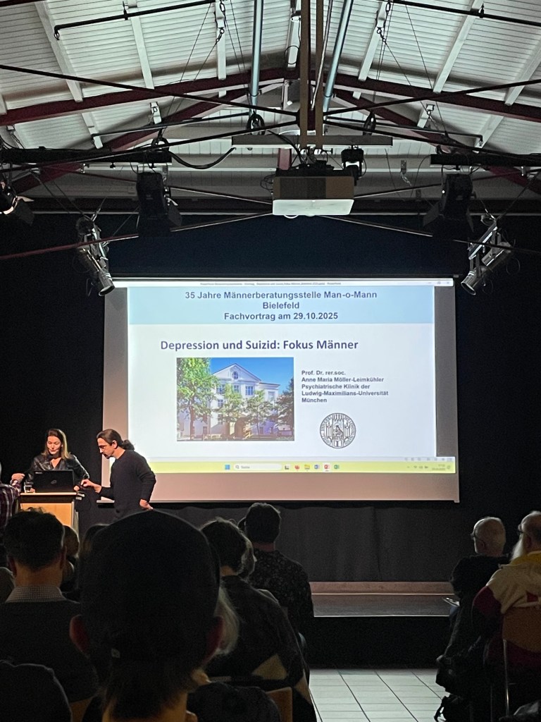 Den Schwerpunkt des Abends bildete der Vortrag von Prof. Dr. Anne Maria Möller-Leimkühler: „Depression und Suizid – Fokus Männer“. Zwei zentrale „Genderparadoxe“ standen am Anfang: Männer erhalten seltener eine Depressionsdiagnose, sterben aber etwa dreimal so häufig durch Suizid. Und obwohl Suizidraten langfristig zurückgegangen sind, bleibt dieser Abstand seit Jahrzehnten bestehen. Die Referentin machte sehr klar, warum: Depressionen bei Männern werden oft übersehen, weil Symptome anders erscheinen. Weniger „klassisch“ traurig-rückgezogen, häufiger äußerlich: Reizbarkeit, Aggression, Risikoverhalten, Substanzkonsum. Hinzu kommen Barrieren der Hilfesuche: Stigma, Selbststigma, das Ideal der „Selbstbeherrschung“ und die Angst, im Beruf an Ansehen zu verlieren. Besonders gefährdet sind Männer mittleren und höheren Alters; häufig wirken psychosoziale Faktoren (Arbeitsdruck, Trennung, finanzielle Unsicherheit) zusammen mit Depression und Alkoholmissbrauch.