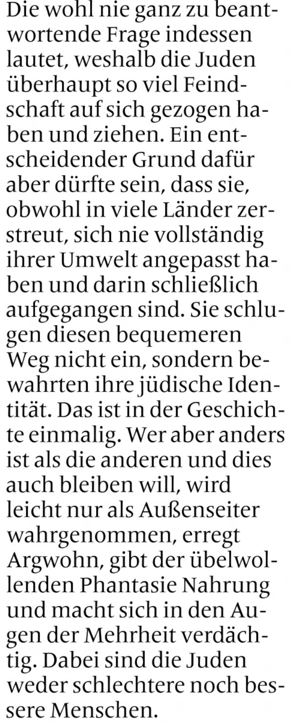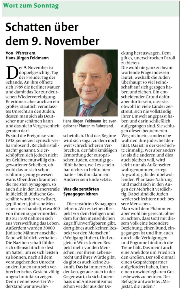 Dass solche Passagen im Westfalenblatt als „Wort zum Sonntag“ erscheinen, ist besonders heikel. Ein christlicher Zugang müsste nicht die Frage stellen, warum Juden gehasst werden, sondern warum Menschen hassen. Er müsste Solidarität betonen, Verantwortung benennen und Opfer schützen, statt nachträglich kulturelle Differenz als Ursache von Gewalt zu konstruieren. Erst recht in einem Text anlässlich des 09. November 1938.