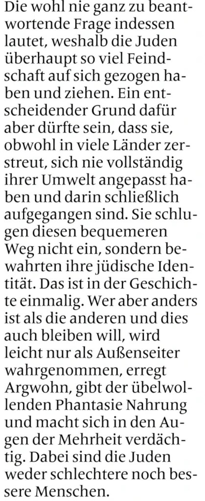 Die Behauptung, es handle sich bei dieser „Andersartigkeit“ um den „entscheidenden Grund“ für Verfolgung, blendet vollständig aus, dass Antisemitismus kein rational erklärbares Phänomen ist, sondern ein irrationales, ideologisches. Judenhass entsteht nicht „wegen“ des Judentums, sondern „trotz“ der realen Vielfalt jüdischen Lebens. Er ist eine Projektion der Mehrheitsgesellschaft, die eigene Ängste, Krisen und Schuldgefühle externalisiert.